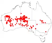 It is widely distributed throughout arid and semi-arid parts of Australia, occurring in Western Australia, South Australia, and southern parts of the Northern Territory. It is usually found in red sandy or loamy soils, often along creek lines or in the swales of dunes.[2]