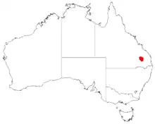 It is endemic to a small area to the north of Chinchilla within the Barakula State Forest, where it grows in sandy or pale loamy-sandy soils over sandstone as a part of Eucalyptus woodland communities.[1] It is found in a similar habitat as Acacia gittinsii consisting of tall shrubland or shrubby woodland with other species of Acacia as well as Eucalyptus tenuipes, Corymbia trachyphloia and Triodia mitchellii.[2]