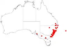 Acacia binervia is found in central New South Wales from the Hunter Region south, and to Bungonia in the southwest, and continuing south into Victoria.[1] In the Sydney basin, it grows on a variety of soils and associated plant communities—alluvial soils, sandstone-, shale- or trachyte-based soils, generally with good drainage. It grows in dry sclerophyll forest, associated with such species as yellow bloodwood (Corymbia eximia), grey gum (Eucalyptus punctata), narrow-leaved ironbark (E. crebra), mugga ironbark (E. sideroxylon), or more open woodland with narrow-leaved ironbark and black cypress pine (Callitris endlicheri), and riparian (riverbank) forest with river peppermint (E. elata) and gossamer wattle (Acacia floribunda).[5]