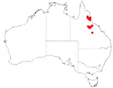 It has a disjunctive distribution and is located in Occurs Petford, Herberton and Mount Garnet areas and the Lolworth and Great Dividing Range at the headwaters of Torrens Creek and the Cape River in North Queensland with another population found about 300 km (190 mi) further south in the Cudmore National Park. It is usually situated in elevated areas that are around 500 m (1,600 ft) above sea level growing in shallow sandy soils with a sandstone base as a part of woodland communities along with Corymbia trachyphloia and Acacia shirleyi. It is also occasionally found along sandy banks of minor watercourses at lower elevations.[1]