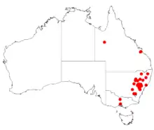 It is found in the state of New South Wales mostly of the slopes of the Great Dividing Range from around Burrenjuck in the south out Mount Coricudgy in the east and to Baradine in the west. It is found on rocky areas as a part of dry sclerophyll woodland communities.[1]