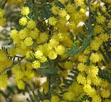 The shrub typically grows to a height of 2 to 3 m (6 ft 7 in to 9 ft 10 in) and has feathery like leaves and bright yellow flowers during its July to November blooming period.[1] It can have an erect to spreading habit and often has multiple stems. The dark grey or mottled brown bark is smooth. It blooms between August and November producing inflorescences in groups to 6 to 21 in axillary racemes. Each inflorescence has a zig-zag shaped axis with a length of 1.2 to 6 cm (0.47 to 2.36 in). The spherical flower-heads have a diameter of 3 to 5 mm (0.12 to 0.20 in) and contain 20 to 40 bright yellow flowers. After flowering firmly papery to thinly leathery seed pods that are flat and straight to slightly curved form. The hairy brown pods are 1.5 to 11.5 cm (0.59 to 4.53 in) in length and 4 to 6.5 mm (0.16 to 0.26 in) wide.[2]