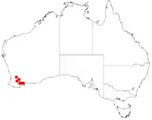It is native to an area in the Wheatbelt and Great Southern regions of Western Australia where it is commonly situated on undulating plains growing in sandy loam soils.[1] It has a disjunct scattered distribution from around Wagin in the north west to around Jerramungup in the south east growing in granitic based soils as a part of Eucalyptus occidentalis woodland communities.[2]