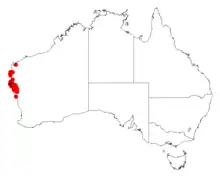 It is native to an area along the west coast in the Mid West and the Gascoyne regions of Western Australia from Northampton in the south up to Canarvon in the north where it is found on and among sand dunes and sand plains growing in sandy to sandy-clay soils.[1] The shrub is often part of dense shrubland communities although at Cape Cuvier it is found among Triodia-shrubland communities growing in alkaline soils.[2]