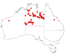 It is native to an area in Queensland, the Northern Territory and the Kimberley and Goldfields regions of Western Australia.[1] It is found from the Sir Frederick Range in Western Australia in the west through central parts of the Northern Territory to around Cloncurry to Mount Isa where it grows in skeletal rocky lateritic and deep sandy soils.[2]