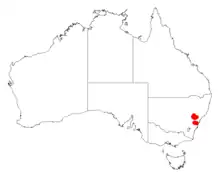 It is mostly found in the areas around Clandulla and Glen Davis growing at higher altitudes in stony sandy or clay-loam soils where it is usually part of open Eucalyptus rossii woodland communities.[2]