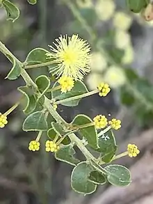 The open pendulous shrub typically grows to a height of 1 to 2 metres (3 to 7 ft).[2] It has slightly ridged densely hairy branchlets that become terete. Like most species of Acacia it has phyllodes rather than true leaves. The evergreen phyllodes are quite crowded and have a circular to broadly elliptic or obovate shape with a length of 0.4 to 1.6 cm (0.16 to 0.63 in) and a width of 3 to 11 mm (0.12 to 0.43 in). The light gren phyllodes are sparsely hairy when young and have a subprominent midvein.[1]