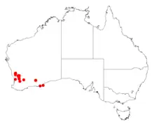 It has a scattered distribution in the Wheatbelt of Western Australia where it grows in sandy, clay gravelly soils often around laterite.[1] Found in areas around Watheroo and Manmanning as a part of sandy heathland communities.[2]