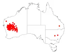 It is endemic arid to semi-arid areas in the Mid West and western Goldfields regions of Western Australia, it occurs in watercourses, on floodplains, on flats, in low-lying areas and alongside rivers goring in red clay or loamy soils or on alluvium and stony red earth.[1]