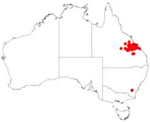 It is endemic to Queensland and is distributed down along the Great Dividing Range from around Moranbah in the north to around Mara in the south and is especially common on the Blackdown Tableland. It is situated in a variety of habitat that is over or around sandstone where it grows in sandy, gravelly or loamy soils as a part of open Eucalyptus woodland communities.[1]