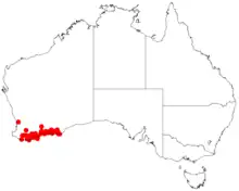 It is native to an area along the south coast in the Goldfields-Esperance and Great Southern regions of Western Australia where it grows in sandy, clay, loamy and gravelly soils.[1] The range of the bulk of the population of the plant is between Cranbrook to Cape Arid National Park with some outlying populations. It usually as a part of mallee shrubland communities but also among heath, low scrub and open wandoo woodlands.[2]