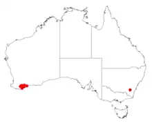 It is native to an area in the Great Southern region of Western Australia where it is found growing in loamy or sandy clay soils.[1] It is found in an area between Borden in the north west, Manypeaks in the south west and Boxwood Hill in the south east where it is often a part of tall shrubland a woodland communities.[2]