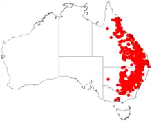 The shrub is found down the east coast of Australia extending from north Queensland down to Victoria. In New South Wales, showy wattle occurs west of the Great Dividing Range while in Queensland it extends to the coast, commonly seen in semi arid areas of the states of New South Wales and Victoria and throughout Queensland.[2] It is sometimes seen in wetter areas in dry sclerophyll forest. Its range extends from around Cooktown in the north down to the Warby Range of Victoria in the south growing in stony sandy soils as a part of Eucalyptus woodland communities.[4]