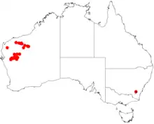 It is native to an area in the Pilbara and Mid West regions of Western Australia where it is commonly found in river beds, hardpans and floodplains where it grows in loam, clay, alluvium and red sandy soils.[1] It has a discontinuous distribution and is often found around the headwaters and upper catchment areas of the Fortescue, Gascyone and Murchison Rivers where it is found on alluvial plains growing in loamy soils as a part of low woodland or shrubland communities and are known to form pure stands.[3]