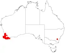 It is found in an area in the southern Wheatbelt, Peel, South West and Great Southern regions of Western Australia that is most often found along watercourses, around swamps and other damp areas[1] although it also is found in drier areas such as loamy laterite in Jarrah forest as well as in coastal heath communities.[2]