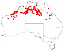 It is found in an area of the Kimberley region of Western Australia.[1] extending into the top end of the Northern Territory and into western and central Queensland. It grows on undulating pindan plains in red sandy-gravelly soils.[1] It is distributed from south of Broome in the west to as far east as Barkley Downs Station in western Queensland.[2]