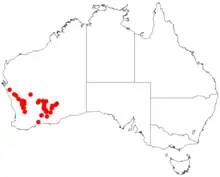 It is native to an area in the Wheatbelt and Goldfields-Esperance regions of Western Australia where it is commonly situated among granite outcrops and on plains growing in sandy or sandy loamy granitic soils.[1] It has a scattered distribution from around Mullewa and Paynes Find in the north to around Tammin, Cardunia Rocks and Bromus in the south as a part of scrubland communities usually dominated by various species of Eucalyptus, Acacia or Allocasuarina acutivalvis.[2]