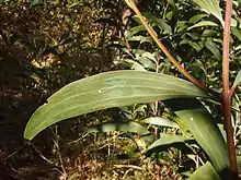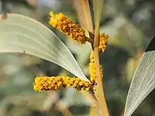 The shrub is open and spindly and typically grows to a height of 1 to 5 metres (3 to 16 ft). It blooms from July to October producing yellow flowers.[1] The main branches coming from the base are ascending to erect, crowns have sparse foliage are normally open and spreading. The bark on most branches is smooth thin and grey but it does darken and become longitudinally fissured at base of the main mature stems. The silvery to silvery blue-green phyllodes are falcately recurved over their entire length. Each phyllode is 8 to 19.5 centimetres (3 to 8 in) in length and 7 to 22 millimetres (0.3 to 0.9 in) wide. There are one or two simple inflorescences on each axil forming light golden flower spikes that are 15 to 33 mm (0.6 to 1.3 in) with flowers densely arranged within. Following flowering red-brown to dark brown linear seed pods form. Each pod is 4 to 11 mm (0.16 to 0.43 in) long and 3 to 4 mm (0.12 to 0.16 in) and are straight to shallowly curved. The seeds within are obloid and dark brown to black with a yellow anil.[2]
