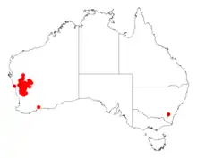 It is native to an area in the Mid West and Wheatbelt regions of Western Australia and is commonly situated on saline depressions, stony clay flats and around salt lakes growing in clay, clay-loam and sandy soils.[1] The range of the plant extends from around Boolardy Station and Cue in the north down to around Wongan Hills in the south where it is found in low woodland and tall shrubland usually dominated by other species of Acacia.[2]