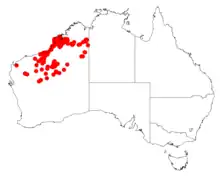 It occurs on red sandy soils in the Carnarvon, Central Kimberley, Dampierland, Gascoyne, Great Sandy Desert, Little Sandy Desert, Ord Victoria Plain, Pilbara and Tanami IBRA bioregions.[2] It is associated with pindan habitats. It is mostly found in the Kimberley region with some of the population found in the Pilbara where it is found in along watercourses and on low rocky ranges where it grows on deep red sand and alluvial pindan plain in sandy soils.[1]