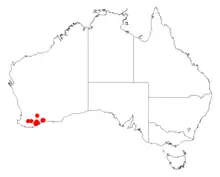 It is endemic to an area in the Goldfields-Esperance, Wheatbelt and Great Southern regions of Western Australia found on undulating plains and clay pans growing in gravelly clay-loam-sand soils.[1] It has a scattered distribution between Broomehill in the west, Albany in the south and Ravensthorpe in the east. It is most often a part of woodlands usually mallee and Acacia shrubland communities.[2]