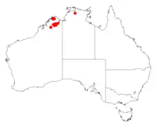 It is native to an area in the Kimberley region of Western Australia[1] around 150 to 300 km (93 to 186 mi) south west of Wyndham where it has a scattered distribution across a few areas including Adcock Gorge between Pentecost Downs Station and Kalumburu and is commonly situated on sandstone hills.[2]