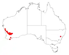 It is native to an area in the Wheatbelt region of Western Australia from around Coorow in the north west to around Southern Cross in the south west and has a scattered distribution. It is found on sand plains growing in gravelly to sandy soils around laterite[1] as a part of shrubland communities.[2]