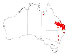A. glaucocarpa has a wide distribution in open forest or woodland area in southeastern Queensland from approximately 80 kilometres (50 mi) west of Emerald south to close to the New South Wales border, it is common near Kingaroy and Ipswich. It is known to occur within protected areas and is found in many localities. It grows on sandstone or sedimentary rocks, often in deep soil.[1]