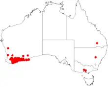 The shrub is found over a large area through the Great Southern, southern Wheatbelt and southern Goldfields-Esperance regions. It is found from Arthur River in the west and north to Esperance in the east and south to the coast. It grows in gravelly clay lateritic soils.[2] The plant is often part of woodland, tall shrubland and mallee communities.[3]