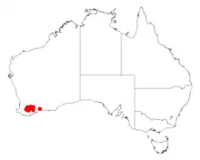 It is native to an area in the Wheatbelt and Great Southern regions of Western Australia where it is commonly situated on slopes and undulating plains growing in gravelly loamy lateritic soils.[1] The range of the plant extends from around Kukerin in the north to around Kojonup in the south west and Brommehill in the south east.[2]