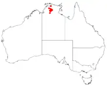 It is endemic to the top end of the Northern Territory where it is found in a tropical climate in a small area in Nitmiluk National Park between Katherine Gorge and Gunlom Falls where it is usually situated on steep hillsides and on sandstone cliffs where it is found among rocks growing in skeletal sandy soils.[1]