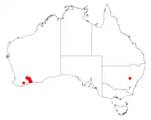 It is native to an area along the south coast in the Goldfields-Esperance and Great Southern regions of Western Australia where it is found on hilltops and ridges growing in gravelly lateritic soils.[1] The shrub is mostly found between Holt Rock and Ravensthorpe in open woodland or mallee communities.[2]