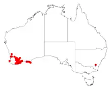 It is native to an area in the southern Wheatbelt, Great Southern and Goldfields-Esperance regions of Western Australia where it is commonly situated among granite outcrops and slopes, lateritic breakaways and on undulating plains growing in sandy or gravelly granitic soils.[1] It has a scattered and discontinuous from around Kulin in the north down to around the Fitzgerald River National Park in the south and as far east as Cape Le Grand National Park as well as some of the islands in the Recherche Archipelago. It is often a part of mallee, shrubland or heathland communities and can be found in saline areas.[2]