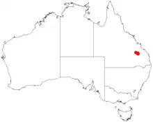 The shrub has a limited distribution on the Isla Gorge National Park area of the Central region of Queensland where it is found on sandstone plateaus growing in skeletal sandy soils among Eucalyptus woodland communities.[2] Its range extends through the central highlands from around Taroom. Originally the species was thought to exist in only three populations within the Isla Gorge National Park but other plants have been found south of Isla Gorge beyond the border of the Wondekai Nature Reserve with more plants located in the Palmgrove National Park.[1]