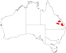 The shrub has a limited distribution in south eastern Queensland from around Taroom in the south and up to around Duaringa in the north.[1]