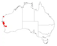 It is native to an area in the Mid West and northern Wheatbelt region of Western Australia where it is found amongst dense shrubland on sandplains, or swales or sand dunes growing in sandy[1] It has a disjunct distribution between Carnamah and Watheroo in the south to near Buntine Rock in the east a little to the north of the Murchison River.[2]