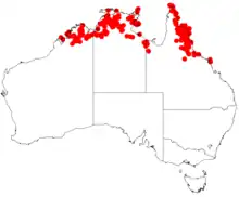 It is native to an area in the Kimberley region of Western Australia where it is often situated on rocky hilltops and slopes growing in sandy soils over quartzite or sandstone bedrock.[1] It is also found on islands in the Gulf of Carpentaria and thorugh the top end of the Northern Territory as well as from around Cape York in the north down to Cape Cleveland down the east coast of Queensland including many of the islands. It is often found on hillsides or in gorges in shallow sandy and rocky soils as a part of heath, low Acacia woodland or Eucalyptus woodland communities.[2]