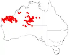 It has a scattered distribution throughout arid areas of the north western tip of South Australia,[4] the south western parts of the Northern Territory[3] and the Pilbara and southern parts of the Kimberley regions of Western Australia where it is found on rocky hillsides, stony hills and plains growing in sandy to loamy stony soils.[1] It is often part of tall shrubland communities with a spinifex understorey.[4]