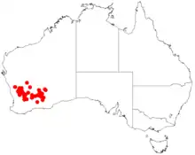 It is native to an area in the Wheatbelt and Goldfields-Esperance regions of Western Australia where it is commonly situated along the margins of salt lakes and salt pans, on flats and plains growing in clay or red sandy soils.[1] It is distributed from around Morawa in the north west down to around Hines Hill in the south east and out to the east as far as about Kalgoorlie as a part of scrubland or open woodland communities.[2]