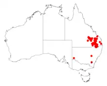 It is native to an area to southern Queensland extending into northern New South Wales particularly in the Yetman district close to the border of Queensland on the north west slopes of New South Wales. Although reasonably rae in New south Wales it is quite common in Queensland. It is mostly located in dry Eucalyptus sclerophyll woodland communities growing in sandy to sandy-loam soils sandy to sandy-loam soils or among dry ranges in clay-loam to loamy soils.[1]