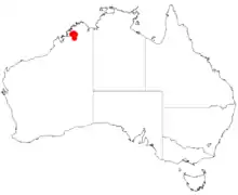 It is native to a small area in the Kimberley region of Western Australia.[1] It has a disjunct distribution between two localities, in the Packhorse Range and around Mount Agnes which is found around 80 km (50 mi) north from the Packhorse range, in the western part of the Kimberley. It is found among rocky outcrops and on plains growing in the sandstone rocks that are veined with quartzite as a part of Eucalyptus miniata woodland over spinifex communities.[2]
