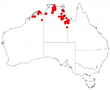 It is native to several small areas in the Kimberley region of Western Australia growing is sandy soils over sandstone.[1] It also has a disjunct distribution in the top end of the Northern Territory and the north western corner of Queensland.[3] It is often found on sandstone plateaux, on cliffs and along watercourses in gullies or in crevices amongst rocky outcrops. It is found around basalt or quartzite growing in stony, sandy and alluvial soils as a part of mixed shrubland communities.[2]