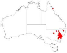 It is native to an area of New South Wales from around Coolah in the north down to around Katoomba in the south and from around Bowral to Wingello as a part of open Eucalyptus woodland communities.[4]