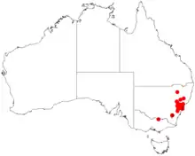 It is native to an area of New South Wales from around Cessnock in the north down to around Richmond in the south on slopes and around creeks in sandy sandstone based soils as a part of open Eucalyptus woodland communities.[1]