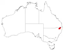 McNutt's wattle grows near rivers and along valleys on sandy soils derived from granite from near Torrington to Boonoo Boonoo Falls, near Pindari Dam and the Washpool National Park, in north-eastern New South Wales.[4][8]