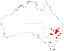 It is found in central New South Wales on the eastern side of the Great Dividing Range from around Hillston and Katoomba in the south to around the Hunter Valley in the east mostly on the slopes and often in the Pilliga Scrub. It is often a part of dry sclerophyll woodland and mallee communities growing in sandy soils.[1]