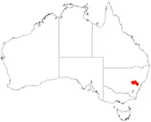 It has a limited range from around Clarence and Mullions Range in the Great Dividing Range in New South Wales where it is found among dry sclerophyll forest or woodland communities growing in clay or sandy soil.[2] The area of its range is estimated to be 68 km2 (26 sq mi) consisting of severely fragmented populations that are in decline. There are three disjunct populations located on the Central Tablelands situated within 100 km (62 mi) of one another.[4]