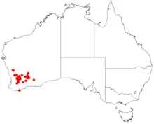 It is native to Wheatbelt, Great Southern and Goldfields-Esperance regions of Western Australia from around Koorda in the north to Coolgardie in the east and Narrogin in the west where it is found in low-lying areas, on hillsides and sandplains growing in rocky sandy soils often around granite outcrops[2] where it is a part of shrubland communities.[3]