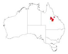 The plant has a limited distribution in North West Queensland to the north and north west of Aramac growing in alkaline, hard, stony, clay soils.[2]