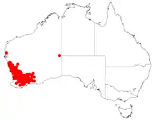 It is native to Mid West, Wheatbelt, Great Southern and Goldfields-Esperance regions of Western Australia where it is found growing in yellow sandy soils. The range of the shrub extends from around Northampton in the north down to around Cranbrook in the south.[2] It extends eastwards as far as to just south west of Coolgardie and the Frank Hann National Park where it is usually situated on sand-plains as an apart of heathland or scrubland communities.[3]
